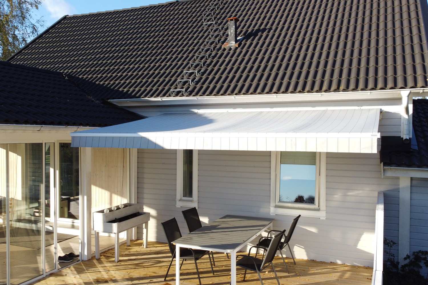 Storleken styrs främst av bredd och utfall, alltså hur bred markisen ska vara och hur långt ut den behöver gå för att ge rätt skugga över uteplatsen. Det påverkar både funktionen och hur markisen upplevs mot fasaden.